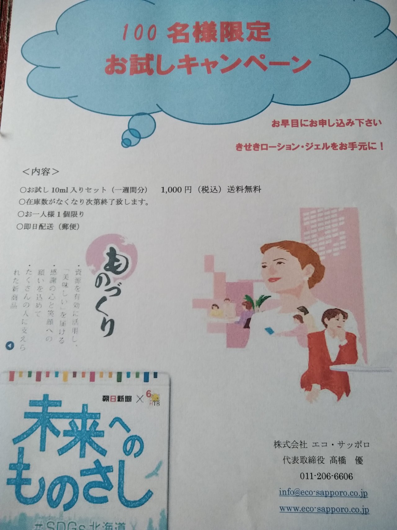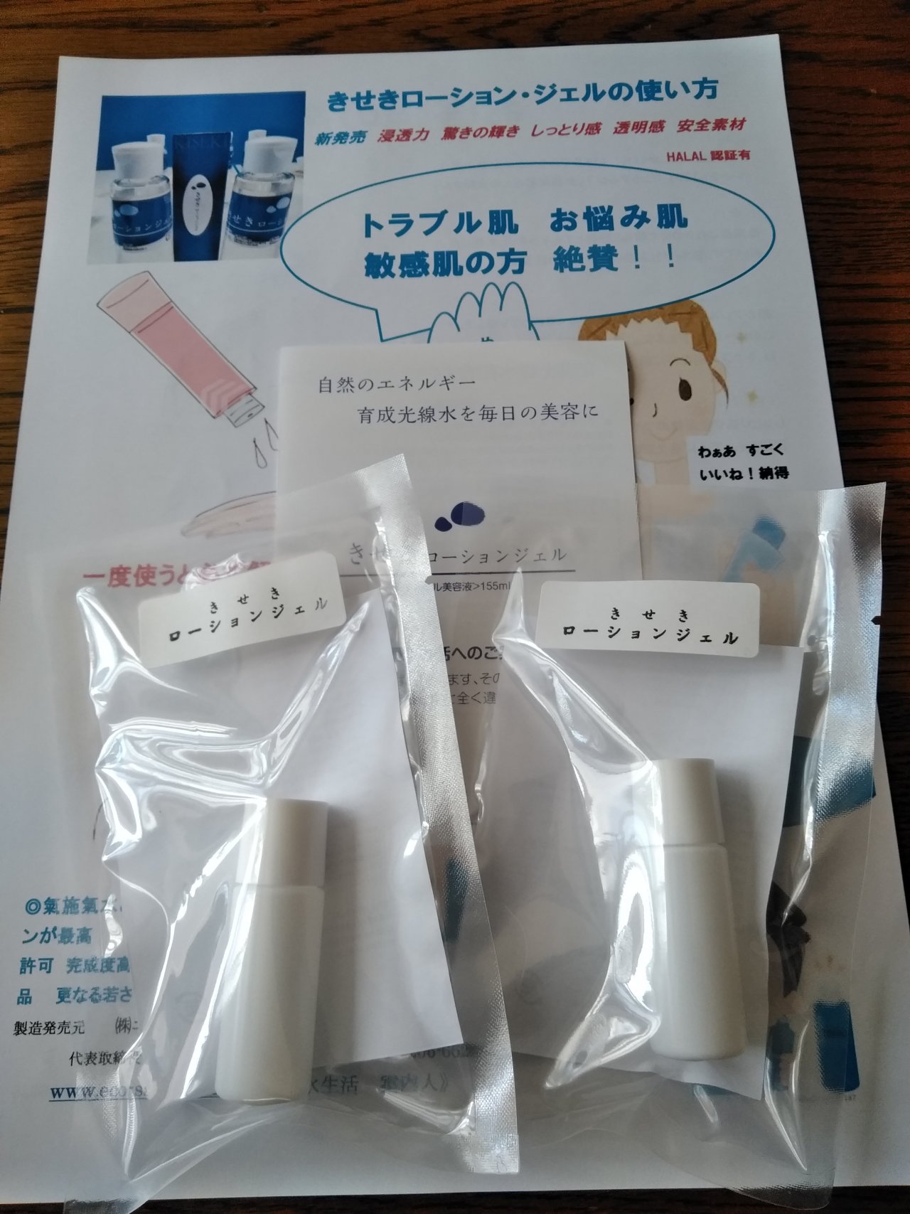 お試しのチラシ7/1からマグロのコラーゲン&エラスチンと弊社の氣施氣の水を使った化粧水 “きせきローション・ジェル”の販売を開始致します。